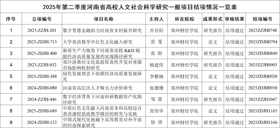 近日,河南省教育厅发布《河南省教育厅办公室关于公布2025年第二季度河南省高校人文社会科学研究一般项目结项情况的通知》(教办社语〔2025〕210号),我校9项河南省高校人文社会科学研究一般项目获准结项。本次我校线上结项申请9项,均通过审核准予结项。具体名单如下: