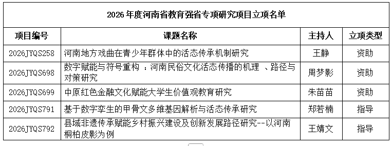 近日,河南省教育厅正式公布2026年度教育强省专项研究项目立项名单,我校申报项目再创佳绩,共5项课题获批立项,其中3项获得经费资助支持。
